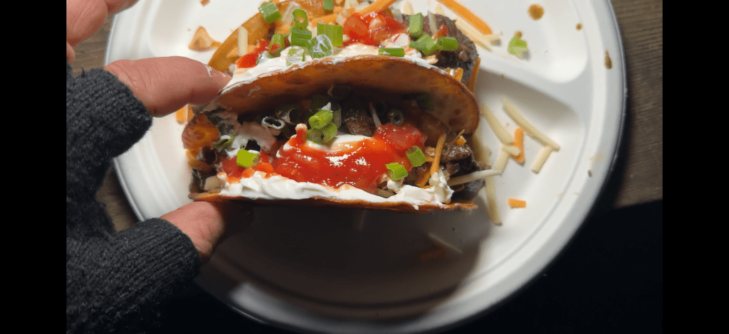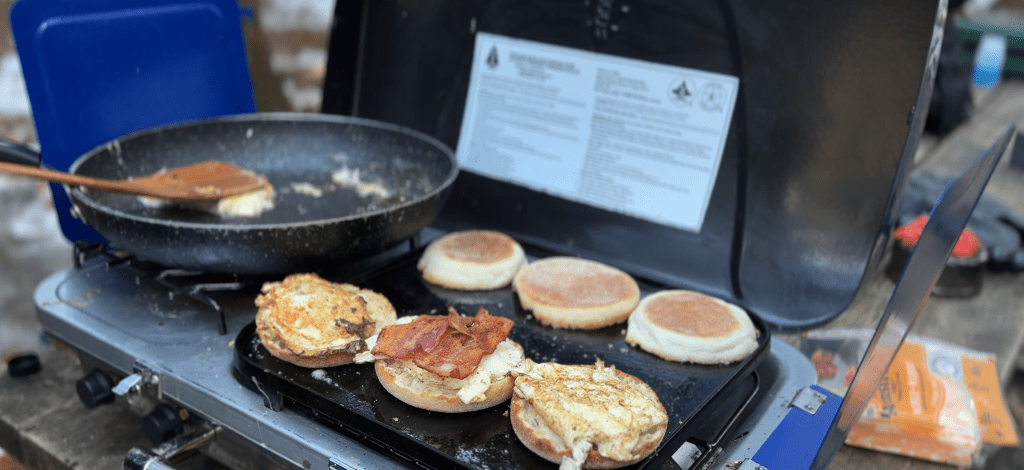 Rob absolutely crushed it with braised beef tacos cooked over the fire. Slow-cooked meat, toasted tortillas, and all the toppings — it didn’t even feel like camping food. It felt like restaurant-level trail cooking.