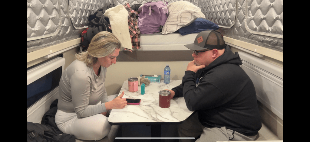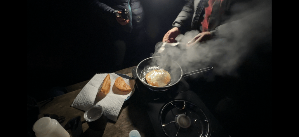 With temperatures below freezing, the campfire quickly became our home base. We spent hours gathered around the flames, warming up, swapping stories, and enjoying drinks while watching the sparks float up into the winter sky.